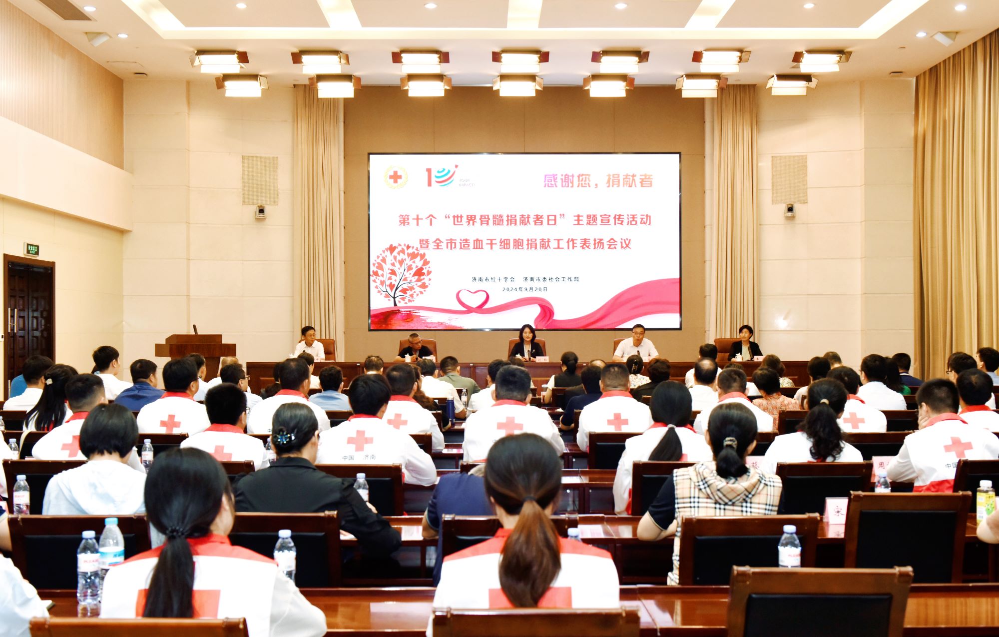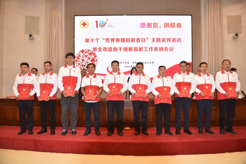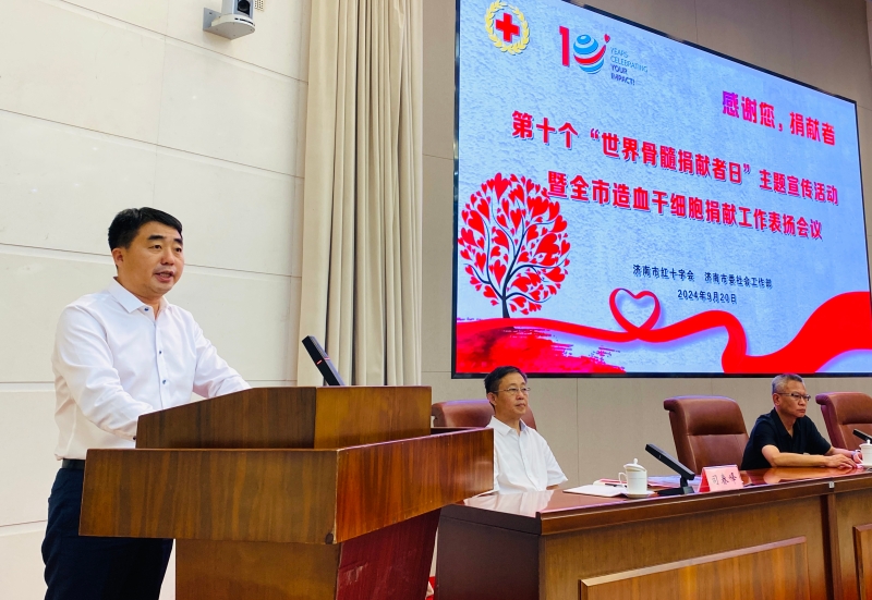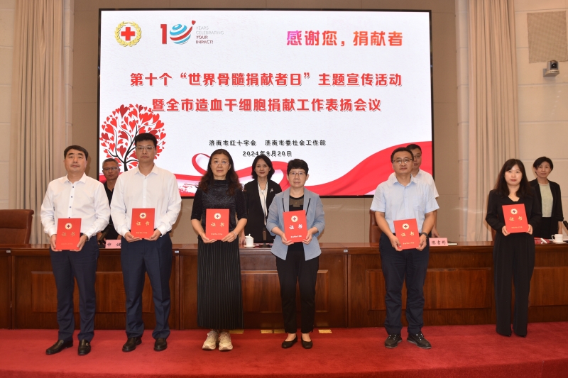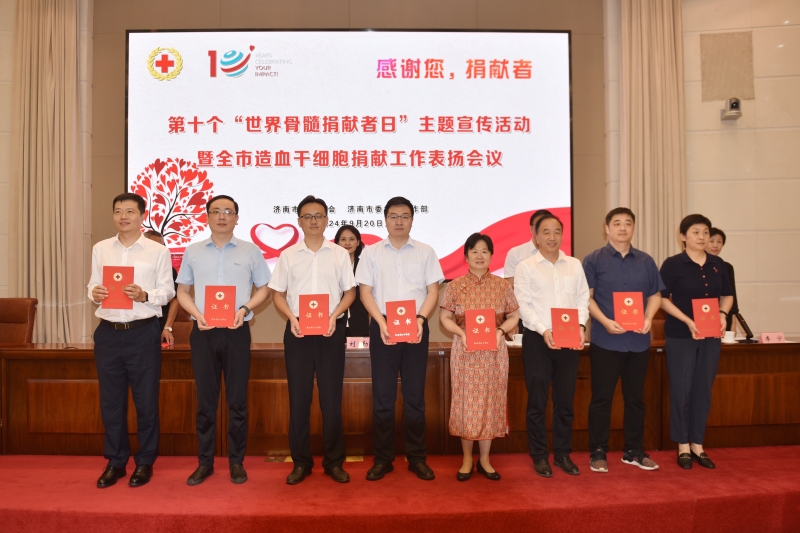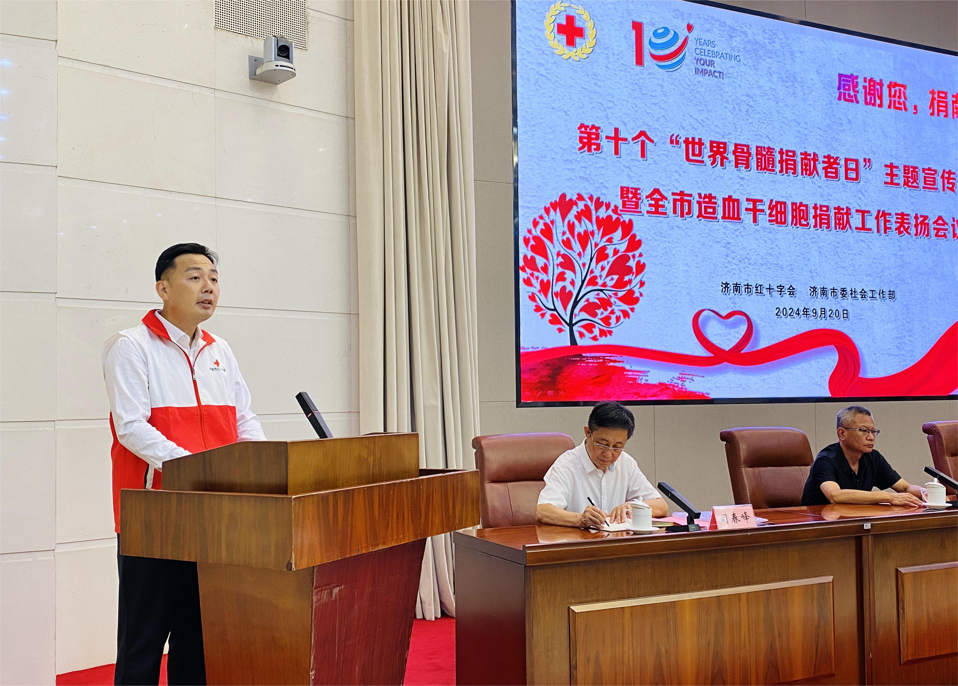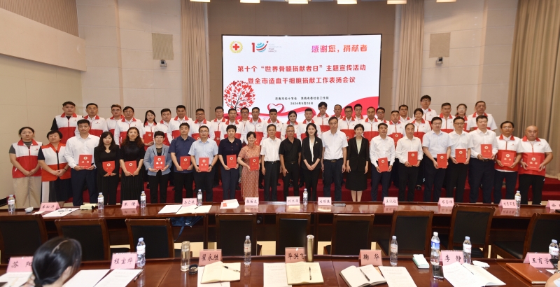 9月20日上午,济南市红十字会联合济南市委社会工作部开展第十个“世界骨髓捐献者日”主题宣传活动暨全市造血干细胞捐献工作表扬会议,济南市红十字会党组书记、常务副会长刘勤,市委社会工作部副部长陈吉彬,省红十字会医学捐献服务中心办公室主任申健,市红十字会党组成员、副会长李宁,市红十字会党组成员、副会长司春峰参加会议。