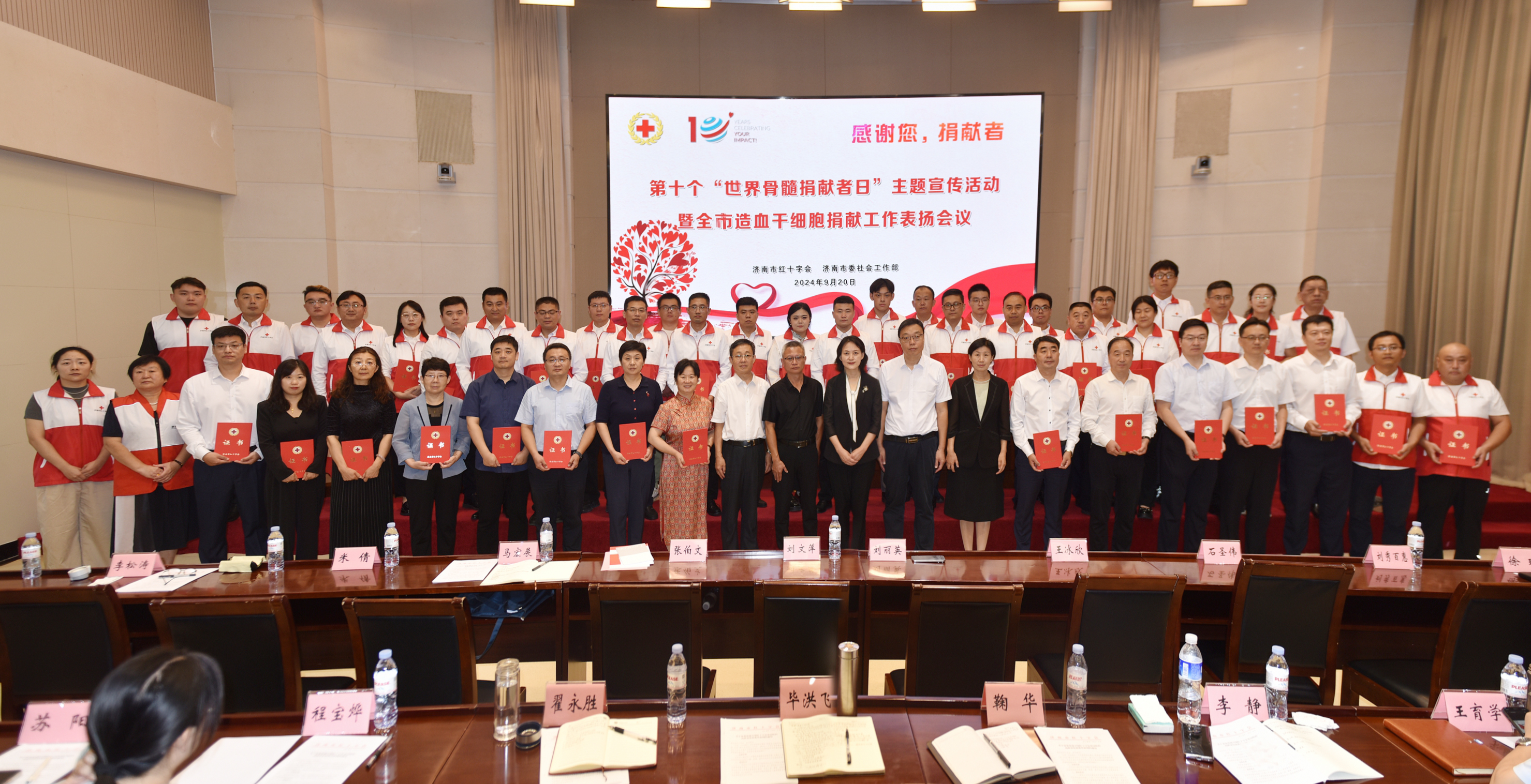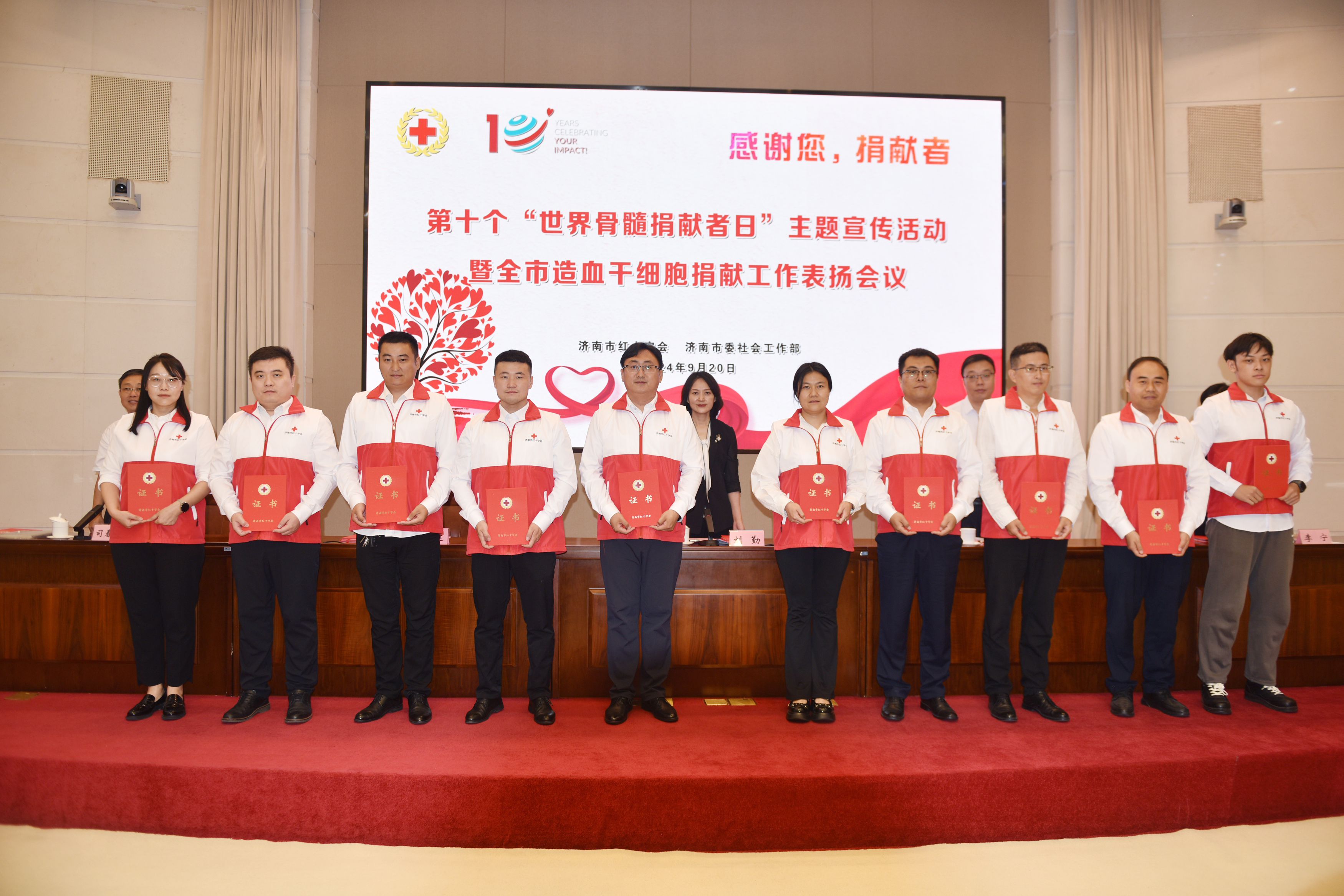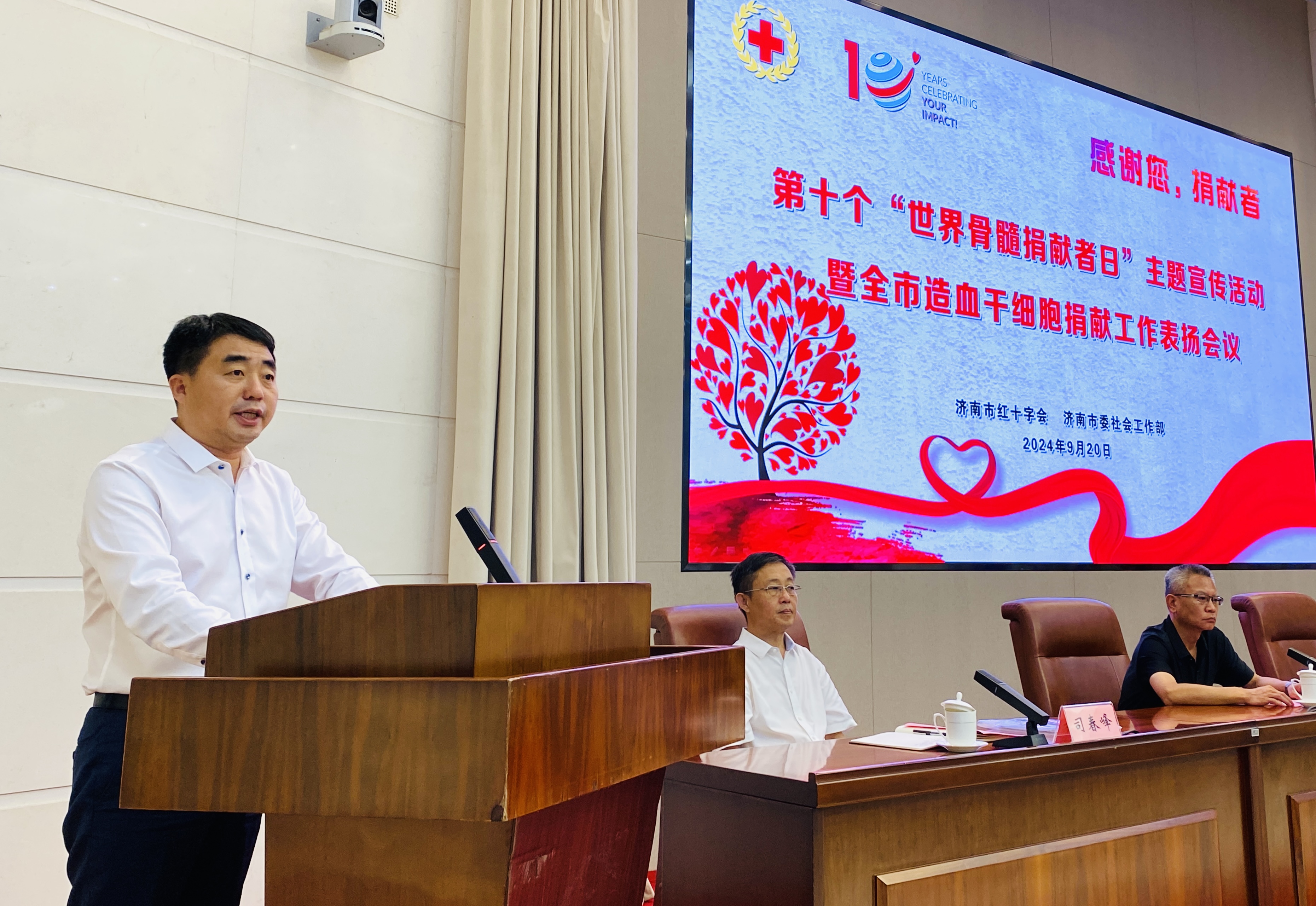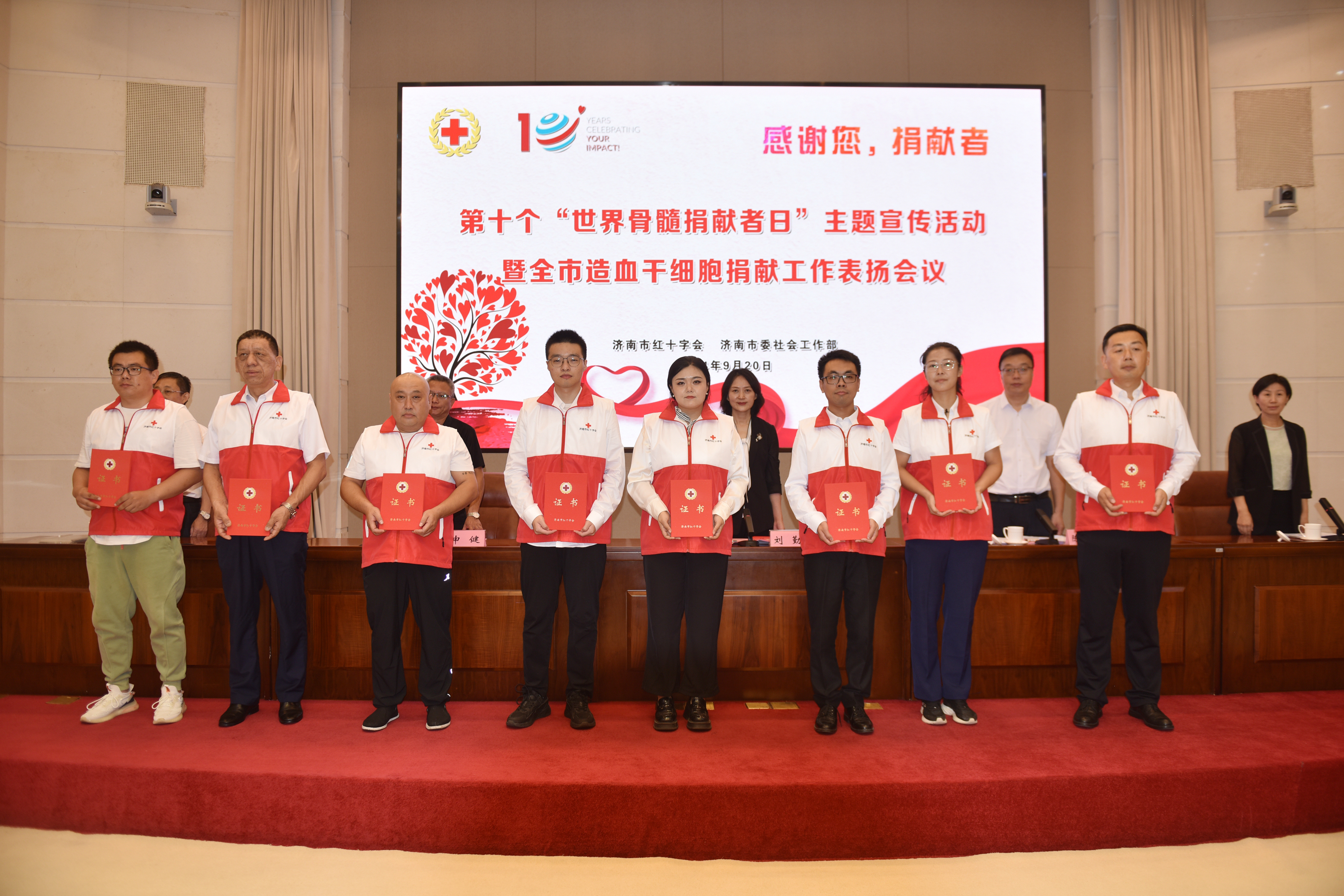 9月20日上午,济南市红十字会联合济南市委社会工作部开展第十个“世界骨髓捐献者日”主题宣传活动暨全市造血干细胞捐献工作表扬会议,济南市红十字会党组书记、常务副会长刘勤,市委社会工作部副部长陈吉彬,省红十字会医学捐献服务中心办公室主任申健,市红十字会党组成员、副会长李宁,市红十字会党组成员、副会长司春峰参加会议。