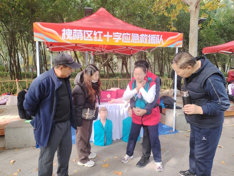活动现场吸引众多市民驻足参与,红十字会志愿者结合公园场景中常见的情况,用通俗的语言讲解应急处理流程,特别强调“先判断、再施救”的核心原则,提醒市民避免盲目救助导致二次伤害。