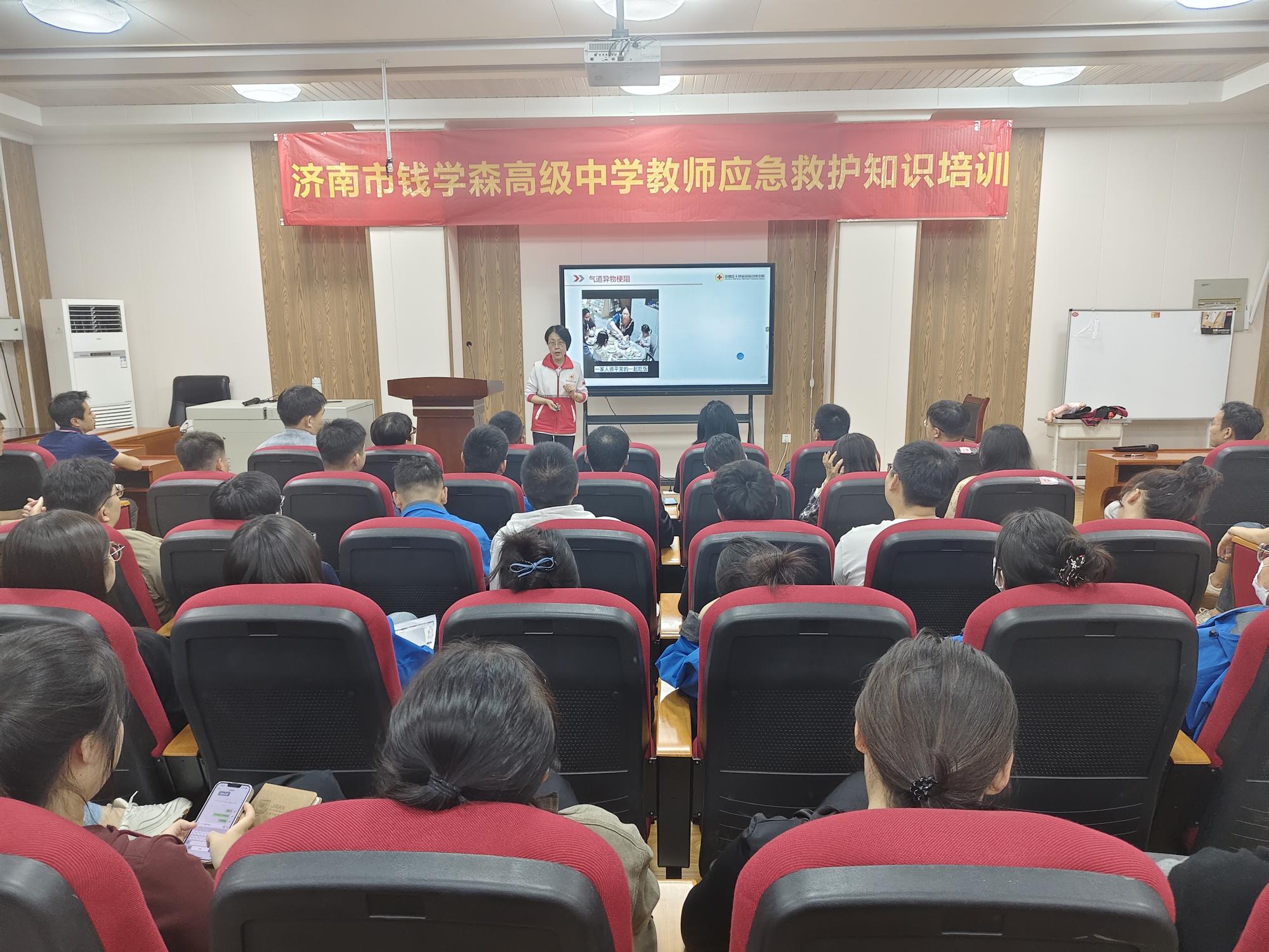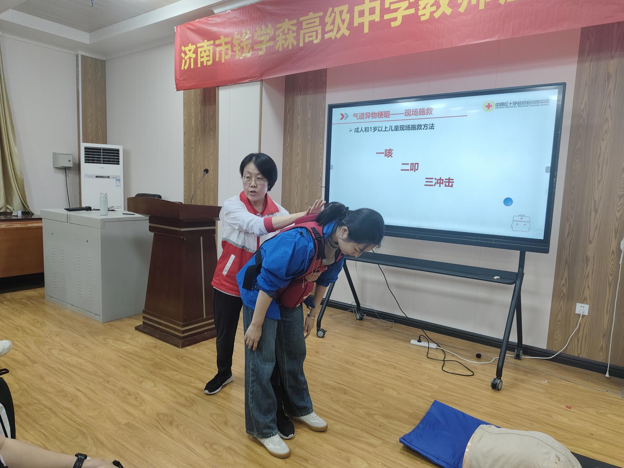 9月24日,章丘区红十字会走进钱学森高级中学,开展应急救护培训活动。围绕气道异物梗阻处理、心肺复苏(CPR)及自动体外除颤器(AED)使用三大核心内容,讲师通过理论讲解与模拟实操,为 50余名教师送上实用的 “生命安全课”。