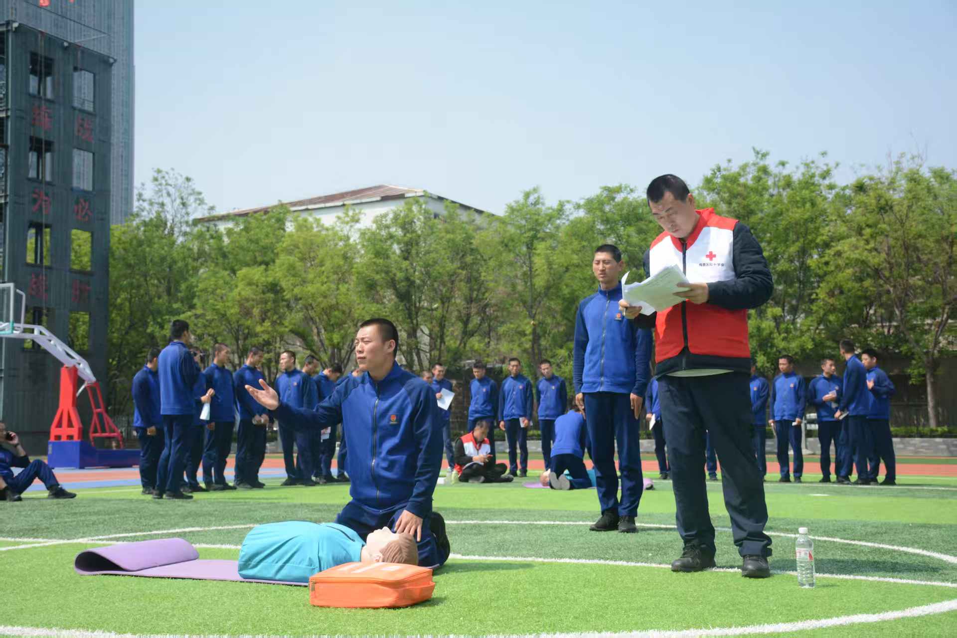 实操演练现场氛围热烈,讲师利用人体模型、AED模拟设备、急救包、三角巾等专业教具,进行标准化动作示范。参训人员分组开展反复练习,从判断意识、开放气道,到胸外按压的深度、频率与节律把控,再到人工呼吸的规范流程、AED电极片粘贴与语音提示执行,每一个步骤都在讲师一对一指导下反复打磨 。