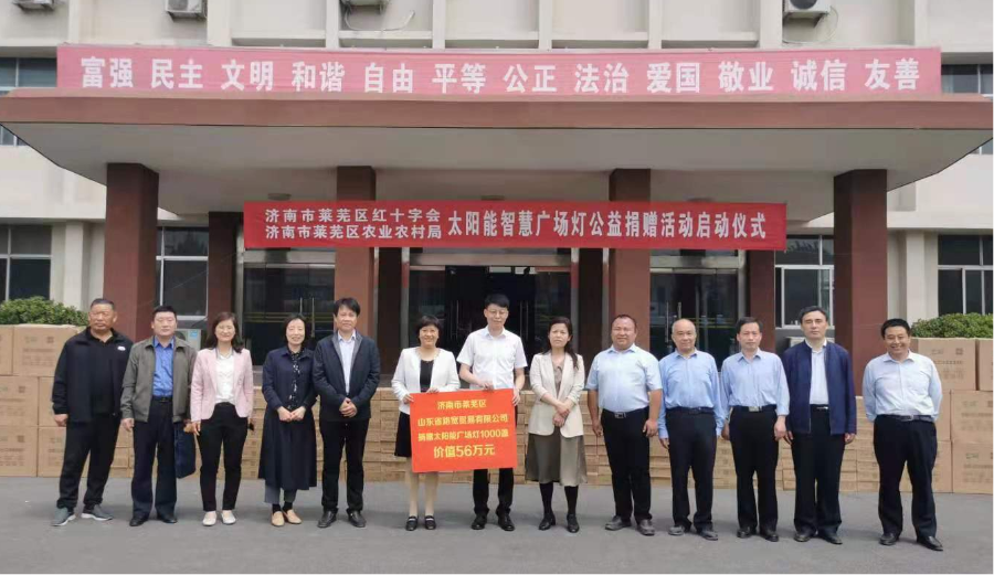 “点亮乡村·平安家园”太阳能智慧广场灯捐赠活动,是济南市红十字会和市农业农村局联合山东省路宽贸易有限公司在全市范围内开展一次便民惠民的大型公益捐赠活动。山东路宽贸易有限公司向我市所有行政村捐赠艺玛牌太阳能智慧广场灯,原则上每个行政村捐赠1盏,每个扶贫村捐赠2盏,共计7000余盏,总价值约400万元。莱芜区作为本次捐赠活动的试点区域,共计接受太阳能智慧广场灯捐赠约1000盏,价值56万元,截至目前已安装完成300余盏,剩余捐赠物品的安装预计于5月底前完成。
